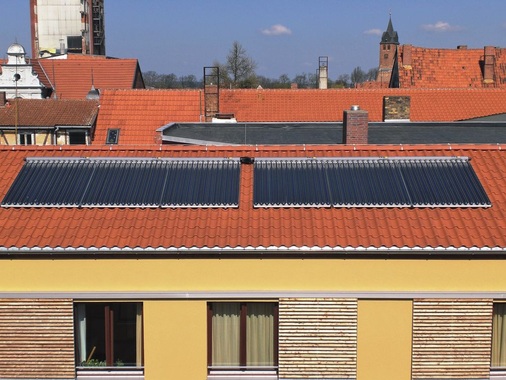 Das zentrale Nutzenargument für die Bauherren ist die Senkung ihrer Energiekosten. Als weitere „Motivations“-Faktoren kommen hinzu: ein anstehender Austausch der Kesselanlage, BZSM-Forderungen, überschrittene Abschreibungsfristen, geplante Sanierungsmaßnahmen sowie ein Umdenken beim Klimaschutz. Die Entscheidung, in eine SGA zu investieren, dauert laut Ehlers in der Regel 6 bis 15 Monate. Bis dahin sind viele technische und logistische Hürden zu meistern. „Die hydraulische Einbindung in die vorhandenen Anlagen ist sehr unterschiedlich und erfordert neben rechnerischer Überlegungen auch sehr viel Praxiserfahrung beim Aufnehmenden und beim installierenden Monteur“, erläutert der Heizungshandwerker. „Darum sind bei uns auch zwei Spezialisten nur für größere Solaranlagen tätig. Darüber hinaus nutzen wir Planungshilfen von Paradigma sowie spezielle Software.“ Für die Montageabwicklung setzt Christoph Ehlers einen (Dach-)Aufzug zum Transport der Kollektoren sowie entsprechende Leitern- und Sicherungstechnik ein. Bei Bedarf werden Dachdecker als Subunternehmer für spezielle Abdichtungsarbeiten auf den Dächern eingebunden.