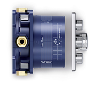 Mit der Rapido SmartBox hat Grohe einen Unterputz-Einbaukörper mit vielfältigen Funktionen entwickelt. Er verfügt über drei Abgänge für ein breiteres Angebot an Duschoptionen und schafft, wofür bisher zwei Unterputzkörper notwendig waren. Darüber hinaus macht er Adapter praktisch überflüssig. Er verfügt über ½-Zoll-Anschlüsse, an die sich alle Standardleitungen anschließen lassen. Die SmartBox ist mit von unten anzuschließenden Zuläufen ausgestattet, die einen direkten Anschluss an die Warm- und Kaltwasserversorgung ermöglichen, 90°-Fittinge werden nicht benötigt. Die Wandrosetten können – dank der Langlöcher in der Funktionseinheit – im Nachhinein noch um bis zu 6° justiert und so an Fliesen und Fugen ausgerichtet werden. Die Installationstiefe beträgt 75 mm. Dank einer optionalen Vorabsperrung erlaubt die SmartBox in nur wenigen Schritten die vollständige Kontrolle über die Wasserversorgung. Sie ist mit einer Sicherungseinrichtung gegen Rückfließen nachrüstbar und erfüllt damit die EU-Norm 1717 bei Installation mit einer Wannenfüllgarnitur. Dank der griffigen Messinganschlüsse kann der Anschluss an die Rohrleitungen mithilfe einer Rohrzange montiert werden, sodass die Installation vor Ort zügig ausgeführt werden kann. Ein Schraubstock ist nicht notwendig.