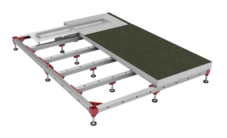 Mit dem bodenebenen Duschsystem Showerfloor hat ACO Haustechnik eine Lösung zur Installation bodenebener Duschrinnen entwickelt, mit der Nachteile traditioneller Methoden der Vergangenheit angehören sollen. Das vormontierte System ermöglicht eine freie Wahl des Bodenbelages ab Fliesengröße 50 mm sowie den Aufbau eines Duschbodens ohne Estrich. Die Niveauanpassung erfolgt durch stufenlose Höhenverstellung mittels von oben verstellbarer Füße. Der Einbauhöhenbereich reicht von 110 bis 195 mm (Oberkante Estrich). Das System steht in zwei Varianten zur Verfügung: für Linienentwässerung und für Punktentwässerung. Beide Varianten sind ausgelegt für einen Anschluss DN 40 (nach Ablängen des waagrechten Ablaufs) bzw. DN 50 mit waagerechter oder senkrechter Stutzneigung. Das System sei so konstruiert, dass schalltechnische Anforderungen bereits werkseitig integriert sind. Es erfüllt laut ACO sowohl die Anforderungen der DIN 4109 als auch der VDI 4100 in der Schallschutzstufe III.