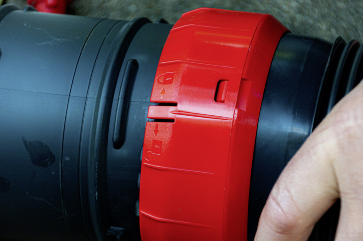 Nach dem Zusammenstecken sichert das Drehen des roten Rings bis zum Einrasten den Halt. Auf diese Weise entfallen die Montage der Fixschellen und des Auszugstops, was einen ein Raumgewinn von etwa 20 mm im Schacht bedeutet. Für Anpassungen oder Kürzungen der Rohrelemente kann die Verbindung einfach demontiert und an einem anderen Element neu installiert werden.