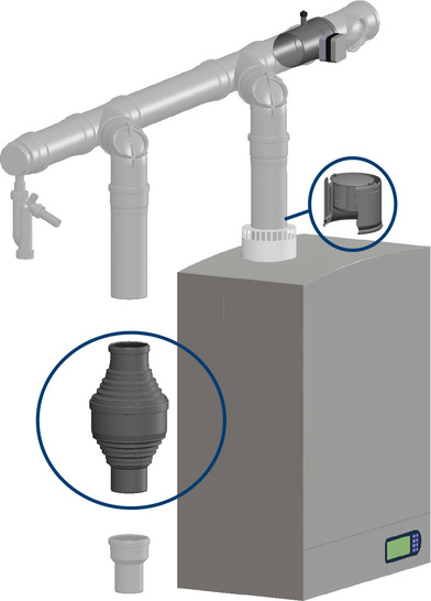 Der Einbau kann abgasseitig im oder am Gerät erfolgen. Vorteilhaft ist die Positionierung innerhalb des Querschnittes; so werden Material- bzw. Herstellerwechsel vermieden. Die Montage funktioniert in einwandigen sowie konzentrischen Abgasleitungen DN 80/125. Der integrierte Siphon hält einem Gegendruck von 350 Pa stand.