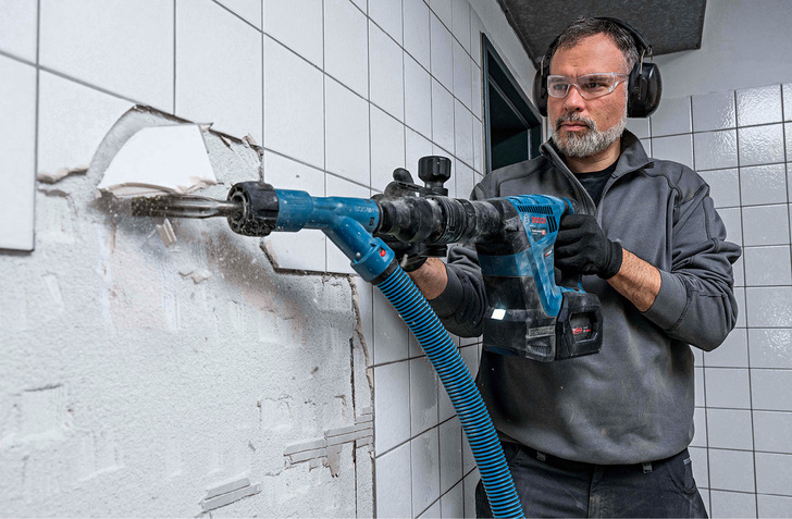 Bosch erweitert das Sortiment für Abbruchwerkzeuge um den GSH 18V-5 Professional. Es handelt sich um einen Akku-Schlaghammer, der die Leistung kabelgebundener Geräte mit Akkutechnik kombiniert. Er bietet eine Schlagenergie von 8,5 Joule und liegt damit auf Augenhöhe mit vergleichbaren Kabelgeräten wie dem GSH 5 CE Professional. Diese Leistung lässt sich am besten mit einem 12,0-Ah-Akku abrufen. Das Professional-18V-System deckt darüber hinaus alle weiteren maßgeblichen Anwendungen mit 18 V ab. Es ist Teil der herstellerübergreifenden AmpShare-Allianz. Das bedeutet: Alle Geräte – auch die anderer Hersteller, die an der Allianz beteiligt sind – lassen sich mit ein und demselben 18-V-Lithium-Ionen-Akku und nur einem Ladegerät betreiben.