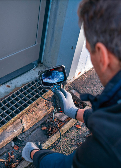 Mit der GIC 12V-5-27 C Professional und der GIC 12V-4-23 C Professional gibt es zwei hochauflösende Inspektionskameras von Bosch. Sie ermöglichen einen schnellen Blick in Rohre, Abflüsse oder Schächte, zum Beispiel um Leckagen oder Blockaden aufzuspüren, ohne dass Wände oder Decken aufgestemmt werden müssen. Die Ergebnisse lassen sich per Bild beziehungsweise bei der GIC 12V-5-27 C Professional sogar per Video digital speichern bzw. dokumentieren. Die GIC 12V-4-23 C Professional bietet ein 4,3 Zoll großes Display mit 800 x 480 Pixeln, die GIC 12V-5-27 C Professional einen 5-Zoll-Bildschirm mit 1280 x 720 Pixeln. Der IP54-Schutz des Geräts stellt sicher, dass die Anwendung in einer staubigen Umgebung oder bei Spritzwasser möglich ist. Beide Inspektionskameras machen es Anwendern leicht, das Kamerakabel in die richtige, zu inspizierende Richtung zu dirigieren. Die GIC 12V-5-27 C Professional kommt dafür mit „AutoUp“-Funktion. Das Bild richtet sich immer automatisch nach oben aus und bietet dem Anwender so optimale Orientierung. Die GIC 12V-4-23 C Professional zeigt dem Anwender über die sogenannte „Up Indication“-Funktion mit einem kleinen Pfeil links unten im Bildschirm jederzeit, wo oben ist.