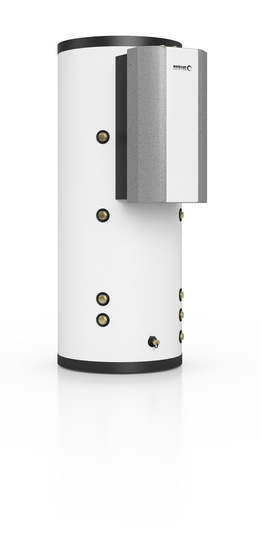 Das Volumen teilt sich in einen ca. 400-l-Pufferbereich für das Frischwassersystem und eine ca. 100-l-Sektion für den Heizkreis auf. Eine Durchmischung wird durch ein Trennblech verhindert. Der Speicher ist werkseitig mit einer 80 mm dicken Hart-schaumisolierung ummantelt.