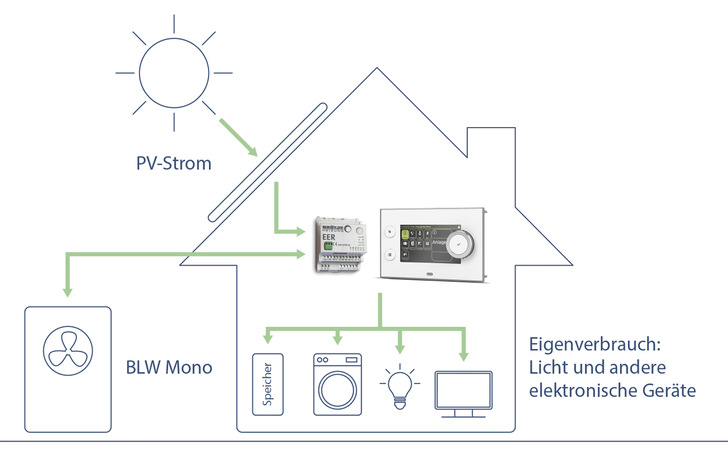 Der Elektro-Eigennutzungsregler EER von Brötje hilft dabei, die Leistung hauseigener Photovoltaikanlagen bestmöglich abzuschöpfen. Liefert die Sonne mehr Strom, als gerade im Haus verbraucht wird, entsteht ein Überschuss. Lagert man diesen für späteren Gebrauch in einer Batterie ein, lässt sich der Eigennutzungsanteil einer Photovoltaikanlage um rund 30 % erhöhen. Eine weitere Alternative bietet jedoch die Variante „Power to Heat“. Hier wandelt eine Wärmepumpe oder ein E-Heizstab übrige Elektrizität in Wärmeenergie um. Sie wird im Heizungswasser gespeichert und dann bei Bedarf abgerufen bzw. verwendet. Diese Methode vermag den Eigennutzungsanteil laut Anbieter zu steigern – bei einem typischen Photovoltaiksystem mit 5 kWp auf rund 80 %.