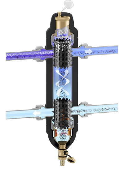Als hydraulische Weiche entkoppelt die Armatur die angeschlossenen Heizkreise. Zudem fungiert sie als Mikroblasen- und als Schlammabscheider. Ergänzend werden über einen Magnetclip eisenhaltige Verunreinigungen abgeschieden.