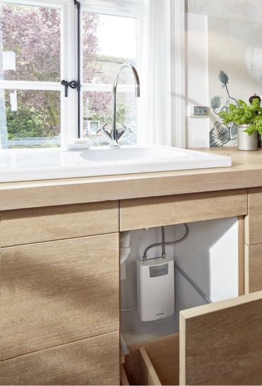 Der E-Kompaktdurchlauferhitzer CFX-U von Clage wird direkt unter der Küchenspüle installiert und liefert sofort heißes Wasser. Mit der Funkfernbedienung kann die Temperatur eingestellt werden. Zwei Speichertasten ermöglichen den Abruf der üblichen Nutztemperaturen in der Küche: milde 35 °C zum Händewaschen und heiße 48 °C zum Spülen. Selbstverständlich lässt sich aber auch jede Temperatur zwischen 20 °C und 60 °C auswählen. Das Gerät wurde speziell für Küchenspülen entwickelt. Es wird über die außenliegenden 3/8"-Wasseranschlüsse direkt an die Küchenarmatur angeschlossen. Für die Versorgung des Durchlauferhitzers sind lediglich ein Kaltwasseranschluss und eine Drei-Phasen-Elektroversorgung einzuplanen. Da das Gerät mit Netzleitung geliefert wird, ist ein Öffnen des Gehäuses für die Installation nicht nötig.