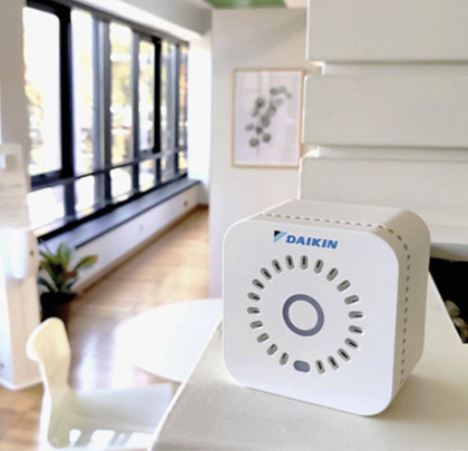Der Indoor Air Quality (IAQ) Sensor von Daikin hilft mit, eine optimale Luftqualität in Innenräumen z. B. von Gewerbegebäuden, Schulen, Restaurants etc. zu gewährleisten. Als eigenständiges Gerät (Maße: 85 x 85 x 60 mm) lässt sich der IAQ-Sensor auf ebenen Flächen aufstellen oder an der Wand montieren. Die Einrichtung und Konfiguration erfolgt über die Daikin Airsense App. Mit seinen zwölf integrierten Sensoren überwacht er 15 Parameter der Raumluft, wie z. B. CO2-Gehalt, Luftfeuchtigkeit, Luftqualität, Temperatur, Feinstaub, aber auch Umgebungslicht, Luftdruck und Elektrosmog. Werden deren Schwellenwerte überschritten, sendet das System eine Warnmeldung. Je nach Örtlichkeit kann der IAQ-Sensor eine Raumgröße mit einer freien Fläche von etwa 200 m² erfassen.
