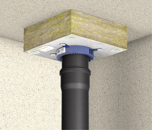 Ausgeliefert wird die Lösung montagefertig inklusive der Brandschutzmanschette Curaflam XS Pro und einem Montageset samt selbstschneidender Betonschrauben. Neben dem Set für gerade durchgeführte Rohre gibt es auch eine Version für zwei unter der Decke anschließende 45°-Bögen. Hinsichtlich der umgebenden deckenunterseitigen Dämmung bestehen keine Anforderungen. Mit dem Produkt werden zudem Rohrabschottungen unterhalb dünner Systemdecken möglich. Die Mindestdeckenstärke liegt dann bei 100 mm.