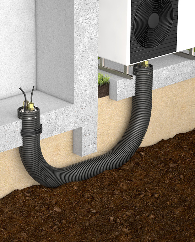 Doyma bietet zwei neue Anschlusssets für Luft/Wasser-Wärmepumpen (Monoblock) an. Während es sich bei der Doymafix Connect HP/B um ein Anschlusssystem für erdberührte Gebäudeaußenwände handelt, ermöglicht die Doymafix Connect HP/P den fachgerechten Anschluss von Wärmepumpenanlagen durch die Bodenplatte. Bei beiden Varianten kann eine getrennte Verlegung der Rohre und Kabel sowie eine separate Führung von Spannungs- und Steuerleitungen erfolgen. Geliefert wird ein anschlussfertiges Komplettpaket inklusive der erforderlichen Abdichtung zum Gebäude. Die Anschlusssets können von nur einer Person montiert werden. Möglich machen dies das flexible Mantelrohr mit geringem Biegeradius von nur 0,5 m, die geringen Rückstellkräfte des Edelstahlwellrohres und die beiliegende Montagehilfe in Form des Bogenzuges zur Herstellung und Fixierung der notwendigen Bögen im Leitungsverlauf des Mantelrohres. Die neuen Anschlusssets sind in DN 32 (in den Längen 3 und 5 m) sowie in DN 40 (in den Längen 10, 15 und 20 m) erhältlich. Damit lassen sich auch Wärmepumpen anschließen, die weit vom Wohnhaus entfernt stehen.