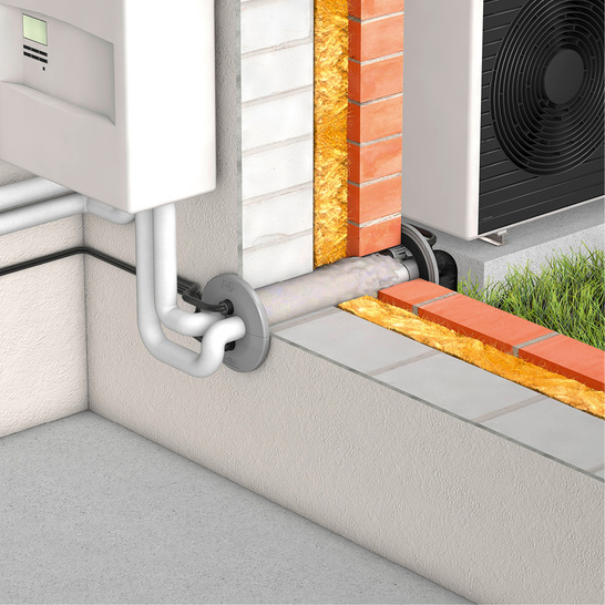 Bei Doymafix HP/O‑S handelt es sich um eine oberirdische Wanddurchführung für Leitungen von Luft/Wasser-Wärmepumpen in Split-Ausführung. Sie verfügt über eine integrierte Wärmedämmung und kann auch für die Leitungseinführung von Klimaanlagen genutzt werden. Die Durchführung eignet sich sowohl für Neubau- als auch für Bestandsgebäude mit unterschiedlichsten Wandaufbauten. Der Einsatz eines Futterrohres ist nur bei innen liegenden Luftdichtheitsebenen erforderlich, ansonsten kann der Einbau direkt in einer Kernbohrung erfolgen. Das geringe Gewicht erleichtert die fachgerechte Installation, eine weitere Montagehilfe ist nicht notwendig. Die Verlegung der Rohre und Kabel kann getrennt erfolgen. Auch Spannungs- und Steuerleitungen werden separat geführt. Die GEG-konforme Durchführung verfügt über geprüfte Luftdichtheit, Schalldämmung und Schlagregendichtheit. Auch die Installation innerhalb des Schutzbereiches bei Wärmepumpen mit R290 ist bedenkenlos möglich.