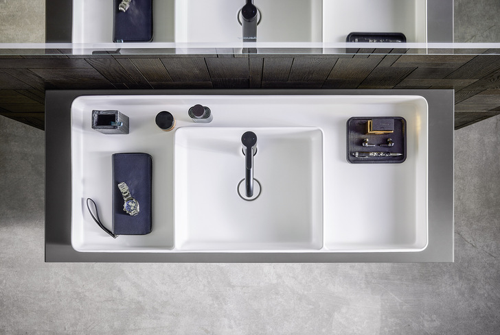 Mit der neuen Duravit-Badserie „Bento Starck Box“ setzen der Hersteller und der Designer Philippe Starck ein Statement für höchste architektonische Ansprüche. Die Inspiration stammt von den traditionellen japanischen Bento-Boxen, die im Inneren durch Trennwände in mehrere Fächer aufgeteilt sind. Mit intelligent aufgeteilten Nass- und Trockenbereichen eröffnen die klar strukturierten Waschplätze und Badewannen individuelle Gestaltungsmöglichkeiten. Das Programm umfasst neben dem 650 mm breiten Waschtisch Aufsatzbecken in verschiedenen Formen, alle erhältlich in den Farben Weiß und Weiß Seidenmatt: rund mit 460 mm Durchmesser, rechteckig in der Breite von 550 mm als Einzelbecken oder für zwei Armaturen in 1140 mm und 1340 mm Breite. Da die Armatur bei allen Modellen im Innenbecken angebracht ist, entstehen keine unnötig nassen Flächen. Zum Programm zählt weiter eine freistehende Infinity-Badewanne aus Acryl in den Maßen 1800 x 900 mm.