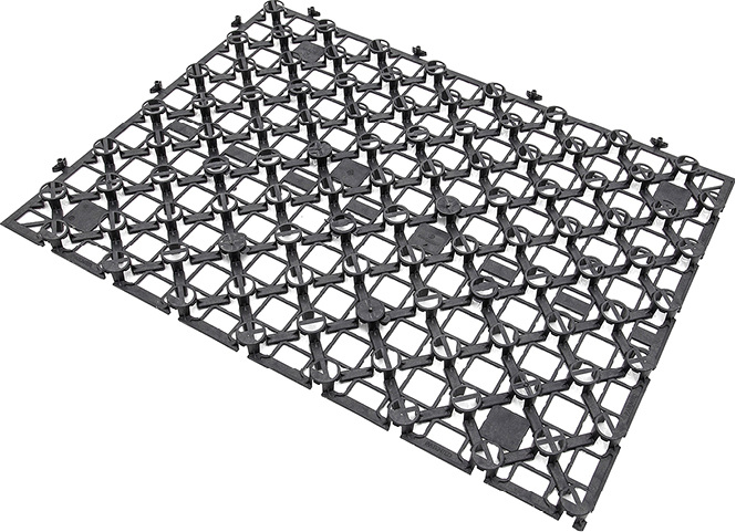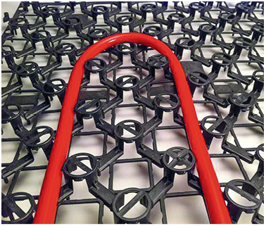 Das Spider-Dünnschichtsystem R979S Giacomini besteht aus einer vorgeformten Verlegeplatte mit einer geringen Gesamthöhe von 22 mm und eignet sich somit besonders für Altbaurenovierungen. Die R979S besteht aus temperaturbeständigem, belastbarem Polypropylen und eignet sich für die Verlegung von Kunststoffheizrohren mit einem Durchmesser von 16 bis 18 mm. Aufgrund der patentierten Noppengeometrie des dreidimensionalen, spinnenartigen Netzes werden die Rohre bei der Verlegung stabil in ihrer Position gehalten. Zusätzlich ermöglicht sie eine optimale Verteilung der Gussmasse. So entfällt die beim Fließestrich sonst übliche nachträgliche Nachbearbeitung mit Gitterwalzen, um die Luftblasen in den Noppen zu beseitigen.