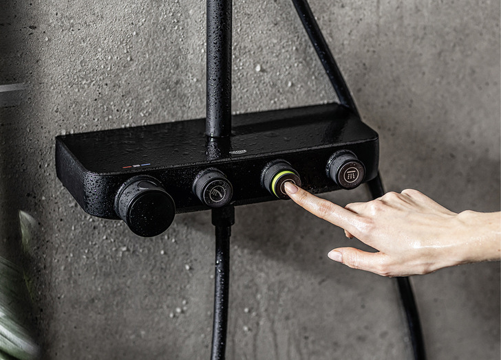 Zusätzlich zur Colors-Kollektion bietet Grohe eine neue Trendfarbe an: das matte Phantom Black. Es eignet sich für elegante, moderne Bäder, die sich klar vom klassischen weiß glänzenden und verchromten Badkonzept abheben. Die Oberfläche ist laut Anbieter langlebig und widerstandsfähig durch die spezielle Drei-Schicht-Lackierung. Zudem sorgen der niedrige Glanzgrad und die hohe Farbintensität dafür, dass Fingerabdrücke kaum sichtbar sind. In der neuen Farbe verfügbar sind die beliebte Armaturenserie Essence sowie Grohtherm Smart-Control, das Duschsystem Smart-Control (im Bild), die Duschbrausen Rainshower Smart-Active sowie die Betätigungsplatten Skate Air und Skate Cosmopolitan.