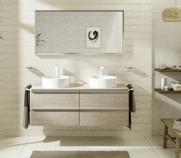 Unter der Bezeichnung Xelu hat Hansgrohe Badmöbel auf den Markt gebracht. Mit unterschiedlichen Breiten von 340 bis 1560 mm schafft das Möbel Ordnung – im Gäste-WC auf kleinem Raum bis zum Familienbad mit einem Doppelwaschtisch. Alle Möbeloberflächen sind feuchtraumgeeignet sowie in Schichtstoff- bzw. Thermoform ausgeführt. Zur Auswahl steht u. a. die Farbe Weiß-Hochglanz sowie Dekorfronten in Eiche Natur und Nussbaum Dunkel. Zusätzliche Akzente setzen die Griffleisten aus Metall, die in Chrom, Mattschwarz oder Mattweiß lieferbar sind. Die Türen und Schubkästen des Möbelprogramms schließen mittels SoftClose-Mechanismus. Einen Pluspunkt in Sachen Stauraum bieten die oberen Schubkästen. Dank des im Lieferumfang beinhalteten Raumsparsiphons ist hier kein Ausschnitt für den Siphon nötig.