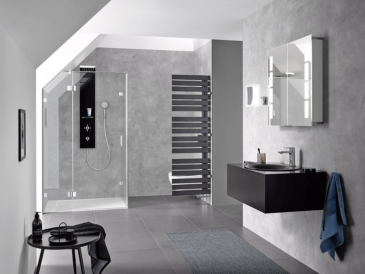 Aperto Pur von HSK ist eine rahmenlose Duschkabine, die sich u.a. für Dachschrägen oder komplizierte Einbausituationen eignet. So lassen sich mit einem Schrägschnitt an der Scheibenkante werkseitig in der hauseignen Glasfertigung des Anbieters leicht Angleichungen vornehmen, wenn die Duschwand an eine Dachschräge angepasst werden soll oder die Badezimmerwand vom lotrechten Maß abweicht. Auch Balken an der Decke oder Erhebungen auf dem Boden sind keine Hindernisse mehr, eine großzügige, moderne Duschkabine einzubauen. Wie alle Duschkabinen der Aperto-Serien verfügt auch Pur über ein innovatives Scharnier. Dieses ist weit nach innen und außen pendelbar, womit die Tür je nach Wunsch in beide Richtungen geöffnet werden kann. Ein sicheres Handling ist garantiert, denn die Tür kann dank eines schmalen Festelements beim Öffnen nach außen z. B. nicht gegen einen Heizkörper oder innen gegen die Armatur stoßen. Die Handhabung wird durch einen leichtgängigen Heb-/Senk-Mechanismus unterstützt. Ein großzügiger Einstieg ist somit auch in engen und komplizierten Einbausituationen möglich. Gleichzeitig vereinfachen die glasbündigen Scharniere die Reinigung der Glasfronten enorm.