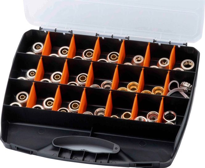 Einen Notdienstkoffer mit allen gängigen Verbindungen für Metall- und Kunststoffrohre stellt Hummel zur Verfügung. Der Koffer enthält die zehn gängigsten Größen von Mehrbereichs-Klemmverschraubungen für Kunststoff- und Metallverbundrohre im Bereich von 12 bis 20 mm. Zusätzlich sind drei Größen von Mehrbereichs-Klemmverschraubungen für Kupfer-, Präzisionsstahl- oder Edelstahlrohre von 10 bis 18 mm sowie verschiedene Kupplungsnippel und Anschlussfittings enthalten. Die Verschraubungen und Anschlüsse können sowohl in Heizungsanlagen als auch in Trinkwasseranlagen verwendet werden. Die gekennzeichneten Verbundkomponenten entsprechen den Werkstoffleitlinien des Umweltbundesamtes für den sicheren Einsatz in Trinkwassersystemen (UBA-konform). Vor Ort wird mithilfe eines Messschiebers das Außenmaß für die Größe der benötigten Überwurfmutter und das Innenmaß für die passende Stützhülse ermittelt. Auf der Deckelrückseite des Koffers befindet sich eine spritzwassergeschützte Tabelle. Anhand der festgestellten Maße können nun die passenden Fächer für die Stützhülse und von drei möglichen Überwurfmuttern ermittelt werden. Das Auffüllen ist dank der aufgedruckten Bestellnummern in den Fächern und auf der Tabelle zeitsparend möglich.