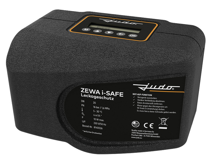 Das Leckageschutzsystem Zewa i‑Safe von Judo verfügt über eine Mikroleckageerkennung, die laut Anbieter bereits minimale Wasserverluste erfasst und daraufhin den Wasserfluss zuverlässig stoppt. Mit einstellbaren Grenzwerten und programmierbaren Öffnungs- und Schließzeiten lässt sich das System an die Gewohnheiten und den Verbrauch der Nutzer bzw. der Nutzung anpassen. Ein dreistufiger Urlaubsmodus aktiviert sich automatisch nach 72 Stunden ohne Wasserentnahme.
