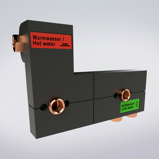 Die thermische Entkopplung der Entnahmearmaturen vom Zirkulationssystem löst dieses Problem. Neue Installationsbauteile mit integrierten Wärmedistanzelementen vereinen die thermische Entkopplung von Wandarmaturen mit der Forderung nach unkritischen Stagnationsbereichen. Sie halten die Temperatur der Armaturen und des darin befindlichen Wasserkörpers auf dem Niveau der Umgebungslufttemperatur der Nasszelle. Beim Kemper ThermoTrenner z. B. erfolgt die thermische Trennung zweifach: zum einen durch Einsatz eines Wärmedistanzelements zwischen Warmwasseranschluss und integrierter Wandscheibe. Zum anderen sorgt die Anordnung der Wandscheibe unterhalb des Warmwasseranschlusses für eine Wärmeschichtung im Medium – auf Grund des Dichteunterschieds sinkt kein warmes Wasser zur Wandscheibe ab.