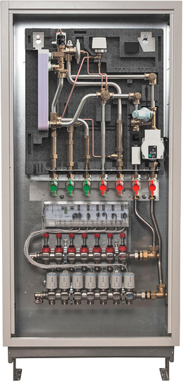 Trotzdem sind die Module durch einen hohen Vormontagegrad mit wenigen Handgriffen sicher installiert und anschlussfertig. Zusätzlich zur Fußbodenheizung lässt sich ein Bad-Heizkörper mittels Direkt-Heizkreis anschließen. Die Wohnungsstation ist für 3- und 5-Leitersysteme erhältlich.