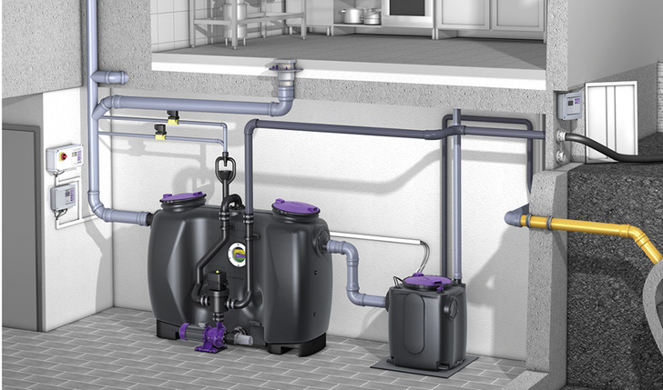 Die Hebeanlage Aqualift S 100/S 200 von Kessel in der Duo-Variante eignet sich für den kombinierten Einsatz mit Fettabscheidern. Die beiden schallentkoppelt gelagerten Freistromrad-Pumpen mit einer Leistung von 650 und 1300 W in der Betriebsart S1 stellen sicher, dass der Entwässerungsbetrieb nie unterbrochen wird. Wenn die erste Pumpe nicht oder nicht ausreichend funktioniert, schaltet sich die zweite Pumpe automatisch zu.