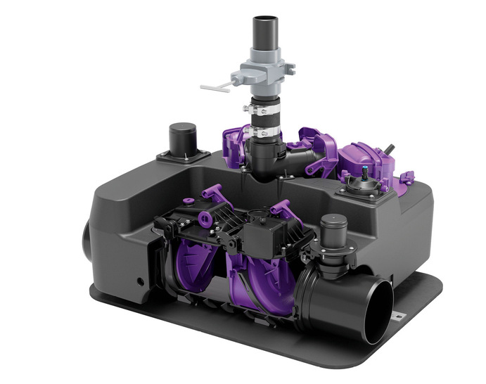 Mit der anteilig aus Rezyklat hergestellten Hybrid-Hebeanlage Ecolift L bietet Kessel eine flexible Alternative zu klassischen Hebeanlagen mit einer Pumpenleistung von 1,35 kW und 6 l/sec. Damit ist die Anlage in den Bereichen Neubau und energetische Sanierung vor allem für Mehrfamilienhäuser, Miethäuser, Doppelhaushälften sowie kleinere und mittlere Gewerbeflächen vorgesehen. Das Funktionsprinzip ist für den Einsatz bei ausreichendem Gefälle von den Ablaufstellen zum Kanal ausgelegt. Die Hebeanlage nutzt im Normalbetrieb die Schwerkraft und pumpt nur bei Rückstau. Auf diese Weise können im Vergleich zu klassischen Hebeanlagen laut Herstellerangaben rund 70 % Strom bei einem geringeren Verschleiß, niedrigerer Lärmemission, reduziertem Wartungsaufwand (Halbierung der Wartungsintervalle im gewerblichen Bereich) sowie höherer Betriebssicherheit eingespart werden. Bei einem Stromausfall kann das Abwasser weiterhin durch das Gefälle abfließen und der integrierte Rückstauschutz verhindert auch in dieser Situation, dass Wasser aus dem Kanal ins Gebäude drückt.