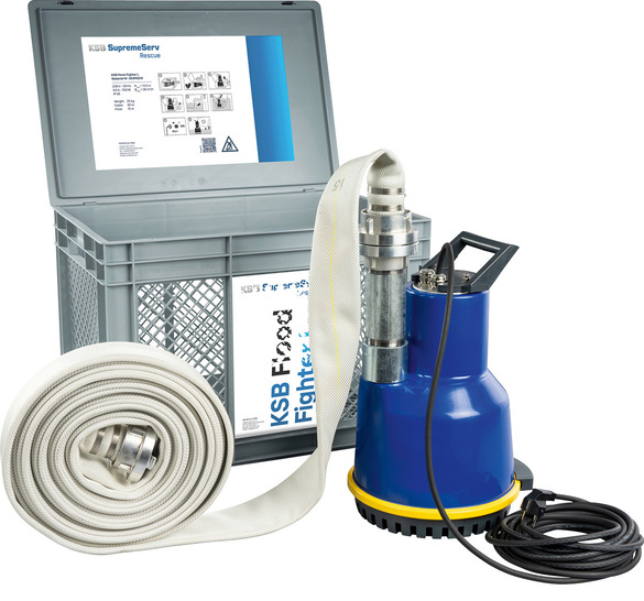 Bei dem Flood Fighter L von KSB handelt es sich um ein leistungsstarkes Plug-and-Play-Entwässerungsset mit einer Kapazität von 28.000 l/h. Die robuste Motorkonstruktion sorgt für Langlebigkeit und verzeiht auch kürzere Trockenlaufphasen. Die Pumpe ist für den verlässlichen Dauerbetrieb ausgelegt. Das Stromanschlusskabel ermöglicht mit seiner Länge von 20 m, auch entlegenere Bereiche von Gebäuden mühelos zu erreichen. Der 15 m lange Entwässerungsschlauch verfügt auf beiden Seiten über Storz-C-Kupplungen, die eine Verlängerung mit weiteren, baugleichen Schläuchen ermöglichen. Ein passender Anschlussadapter ist an der Pumpe ab Werk vormontiert. Die robuste Kunststoffbox sorgt für eine sichere Aufbewahrung und den Transport der Pumpe. Während des Pumpenbetriebs fungiert die Box als Grobschmutzfilter und bietet zusätzlichen Schutz vor Fremdkörpern, welche die Pumpe ansaugen könnte. Optional ist auch ein Stromgenerator erhältlich, der den Betrieb der Hochwasserbox auch bei abgeschalteter öffentlicher Stromversorgung ermöglicht.