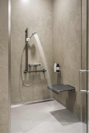KWC Professional hat das Produktprogramm für den Gesundheitsbereich erweitert um barrierefreie Medcare-Ausstattungselemente. Die Stütz- und Haltegriffe in Basaltgrau überzeugen mit angenehmer Haptik und einem gut zu greifenden, ergonomischen Durchmesser von 32 mm. Neben Haltegriffen in verschiedenen Längen gehören ein 90°-Winkelgriff und WC-Stützklappgriffe zum Programm. Beim Winkelgriff mit Handbrausehalterung und dem WC-Stützklappgriff mit Spülauslösung bieten die Funktionskomponenten in Weiß eine visuelle Orientierung für die Nutzer nach dem bewährten 2-Sinne-Prinzip. Zum Sortiment gehören außerdem Spender mit kurzem Edelstahlhebel für Patientenbäder und mit langem Armhebel für Ärzte- und OP-Waschanlagen oder unreine Arbeitsräume.