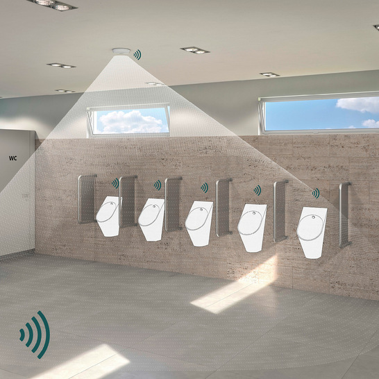 Das smarte Urinalspülsystem von KWC Professional verfügt über einen zentralen Deckensensor für bis zu 20 Urinale, wodurch sich Montagezeiten und Anschaffungskosten reduzieren lassen. Das System rechnet sich laut Hersteller bereits ab drei Urinalen und ist bei zehn Urinalen 15 % sowie bei 20 Urinalen rund 20 % günstiger als elektronische Wandeinbauarmaturen. Die sogenannte Smart-Urinal-Unit wird hinter jedem Urinal oder, falls alternativer Bauraum vorhanden ist, an anderer Stelle installiert. Sie kommuniziert drahtlos mit dem Deckensensor, der die Nutzerpräsenz registriert und automatisch die Spülung auslöst. Die Inbetriebnahme und Steuerung von sowohl Einzelurinalen aus Keramik oder Edelstahl als auch Reihenurinalen ist mit der Smart-Urinal-App möglich. Damit lassen sich Funktionen wie Fließzeitreduktion bei hochfrequenter Nutzung, gruppenweise und kalenderbasierte Hygienespülungen, Reinigungsabschaltungen, serielle Spülauslösungen nach gleichzeitiger Nutzung mehrerer Urinale sowie das Erfassen und Speichern von Statistikdaten realisieren. Das System steht für gängige Keramikurinale von Geberit, Villeroy & Boch und Laufen zur Verfügung.