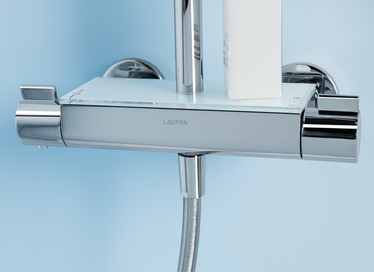 Die thermostatische Showerstation Vivid von Laufen eignet sich auch als Nachrüstlösung. Das Produkt ist für unterschiedlichste Einbausituationen anpassbar, auch für Eckeinbau und niedrige Decken. Die wasserführende Brausestange lässt sich noch auf der Baustelle auf ein Wunschmaß kürzen, ein Vorteil, gerade bei niedrigen Decken. Die Produkt-Sets umfassen je einen thermostatischen Auf-Putz-Duschmischer, eine Regenbrause deren Zulaufrohr zugleich als Duschstange mit Schieber verwendet wird, sowie eine Handbrause. Die Wellnesslösungen sind in zwei Ausführungen erhältlich. Wobei die Größe der Regen- und Handbrausen, zusätzliche Strahlarten bei den Handbrausen sowie die Ablagefläche aus weißem Sicherheitsglas auf dem Thermostatmischer den Unterschied ausmachen. Die Glasablage ist bei der Variante mit den großen Brausen fix montiert und bei der Ausführung mit den kleineren Brausen optional erhältlich. Nebst der klassischen Ausführung in Chrom sind auch Sets mit einer PVD-Beschichtung in Titanschwarz und Inox-Look erhältlich.