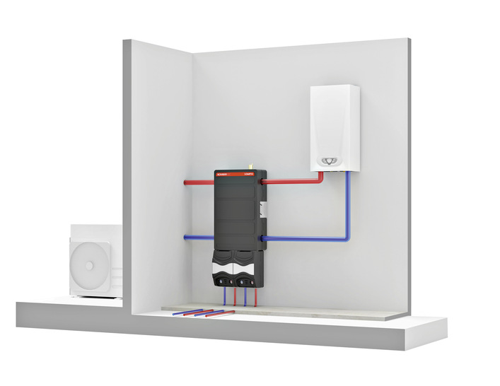 Der kompakte, sehr flache Mini-Pufferspeicher Bomber 50 C (520 x 860 x 240 mm) verfügt über ein Fassungsvermögen von 50 l. Es lassen sich bis zu zwei Wärmequellen anschließen, etwa eine Wärmepumpe und ein Heizkessel. Der Speicher übernimmt dabei die Funktion der hydraulischen Weiche und der Heizkreisverteilung. Die interne Membran und die Konfiguration der Sekundäranschlüsse ermöglichen eine korrekte Flüssigkeitsschichtung. Der für die Wärmepumpe vorgesehene Anschluss (max. 4,5 m3/h) sorgt für eine vollständige Nutzung des Speichervolumens und steigert die Betriebskontinuität. Zudem ist das Modul mit einem Anschluss für die Verbindung eines elektrischen Widerstands mit bis zu 3 kW ausgestattet.