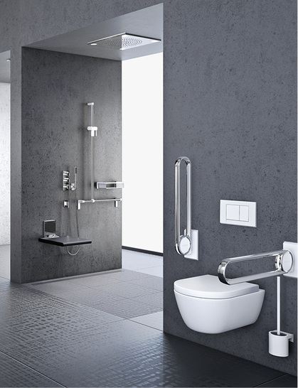 Die Edition Chrome aus der Badserie Cavere von Normbau ist für die ästhetisch anspruchsvolle Ausstattungen für barrierefreie Bäder ausgelegt. Konsolen, Wandbefestigungen und Stützen der Serie sind aus Aluminium mit Pulverbeschichtung in Cavere-Weiß oder Anthrazit-Metallic ausgeführt. Die Griffprofile sind in Chrom hochglänzend ausgeführt. Die trigonometrische Kontur sorgt laut Anbieter für einen besseren Halt als einfache Rundrohre. Kratzfeste Pulverbeschichtungen halten den Belastungen des Alltags zuverlässig Stand. Die neue Serie umfasst Stützklappgriffe, wahlweise auch mit Elektrotaster, Dusch-Handläufen und Winkelgriffen, Klappsitzen, kippbaren Spiegeln, Ablagen und Haltern. Dazu gibt es Badaccessoires vom Zahnputzglas bis zum Abfalleimer.