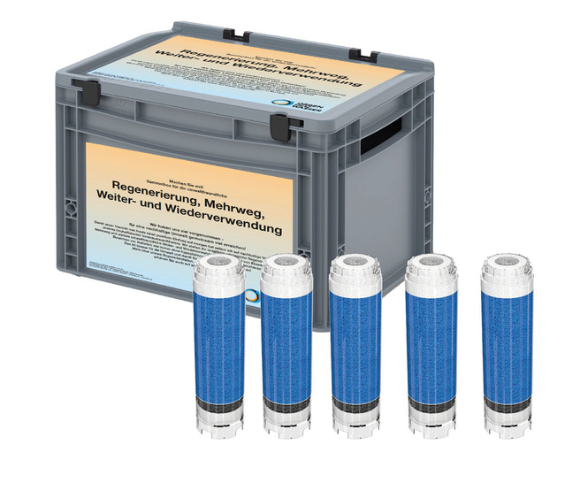 Einen technischen Standard für den ressourcenschonenden Betrieb von Heizwasseranlagen im SHK-Bereich setzt Hersteller Orben, der ab sofort einen Regenerationsservice anbietet. Verbrauchtes bzw. „erschöpftes“ Harz aus Nachspeisekartuschen wird nicht mehr – wie bislang nach dessen Einsatz üblich – entsorgt, sondern regeneriert. Damit wird ein geschlossener Nutzungskreislauf etabliert, der sowohl Kartuschen der Orben-Serien als auch Fremdfabrikate umfasst. Über den Fachgroßhandel werden neue Kartuschen in einer speziellen Transportbox bezogen. Nach Gebrauch werden die erschöpften Einheiten in derselben Box portofrei an Orben zurückgeschickt. Dort wird das Harz in einer Regenerationsanlage ohne Kapazitätsverlust aufbereitet und erneut in den Vertrieb gegeben. Das in den Kartuschen enthaltene Harz zeigt durch Farbwechsel den Austauschzeitpunkt an und ist mit einer Keimbarriere zum Schutz des Trinkwassers ausgestattet. Die Kartuschen besitzen eine Universaldichtung, die die Kompatibilität mit vielen Fremdfabrikaten gewährleistet.