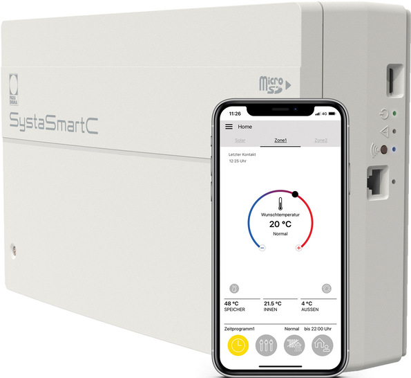Der für Solarsysteme optimierte Regler SystaSmartC bindet bis zu drei Stromzähler ein und optimiert die Wirkungsgrade der gesamten Heizungsanlage. Er wird für die Steuerung aller Komponenten eines Heiz- und Warmwassersystems des Herstellers und für die Verwaltung des Stromverbrauchs eingesetzt. Mit der „Solarvorrang“-Funktion wird die Wärmeerzeugung vom Heizkessel pausiert bzw. das Nachheizen erst aktiviert, wenn keine zeitnahe oder ausreichende Versorgung mit Solarwärme mehr sichergestellt ist.