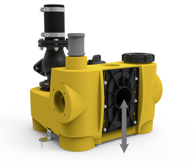 Neu im Zubehör ist ein Notentsorgungsanschluss mit Absperrschieber und Schlauchanschluss (1", 1¼", 1½"). Damit kann der Behälter bei Bedarf mittels Nasssauger oder Handmembranpumpe entleert werden. Ein in den Kunststoffbehälter integrierter Hydraulikbereich mit zwei zusätzlichen Gussringen sorgt für Stabilität, ein geringeres Gewicht und ein optimiertes Strömungsverhalten.