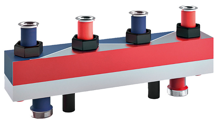 Der Sinus HydroFixx von Reflex ist ein Verteiler mit integrierter hydraulischer Weiche, der eine platzsparende und technisch optimierte Heizungswasserverteilung ermöglicht. Das System vereint die Vorteile eines Kompaktverteilers mit der Funktion einer hydraulischen Weiche und wird in Anlagen von Kleinanwendungen bis hin zu Leistungen über 10 MW eingesetzt. Kernmerkmale sind die kompakte Bauweise durch die unterhalb des Verteilers angeordnete Weiche sowie die sichere hydraulische Entkopplung von Primär- und Sekundärkreis. Durch die direkte Anordnung der Heizkreise nebeneinander lassen sich Systeme nach dem Tichelmann-Prinzip realisieren, wodurch Platzbedarf und Montagezeit deutlich reduziert werden. Technisch zeichnet sich der HydroFixx durch zwei durch eine sinusförmige Wand getrennte Vor- und Rücklaufkammern aus, in die die Öffnungen der hydraulischen Weiche münden. Der gesamte Wasserinhalt der Weiche dient dabei als Puffervolumen und unterstützt längere Reaktionszeiten beim hydraulischen Abgleich. Anders als bei herkömmlichen, senkrechten Bauformen kann die Weiche aufgrund der gewollten Beimischung im Bypassbetrieb sowohl horizontal als auch vertikal eingebaut werden, ohne die Funktion zu beeinträchtigen.