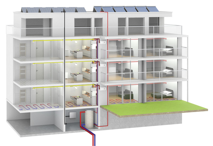 Die modulare Wasser/Wasser-Wärmepumpe MWL vereint im Wohnungsbau die Funktionen heizen, lüften sowie Warmwasser bereiten und lässt sich mit unterschiedlichen Wärmequellen kombinieren. Dabei wird in jeder Wohneinheit ein Gerät platziert. Drei Module bilden zusammen einen kompakten, 205 cm hohen Block. Unten befindet sich ein 149 l fassender Trinkwasserspeicher, darauf die Wärmepumpe und oben ein Lüftungsgerät. Durch das Plug-and-play-Prinzip ist eine rasche Installation gewährleistet.
