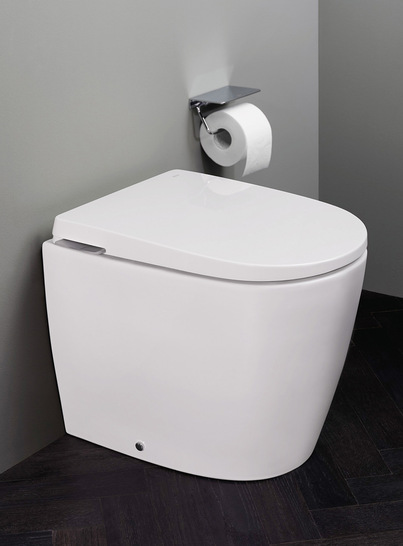Zusammen mit dem französischen Wasserspezialisten Siamp hat Roca all das, was eine Toilette als Spültechnik normalerweise in oder vor der Wand begleitet, in die WC-Keramik Hydro In-Tank integriert. Vier Patente schützen die Entwicklung, deren Kern die Roca-In-Tank-Technologie ist. Dabei wird der Spültank in der Keramik verbaut und – so der Standard – mit einer elektrischen Pumpe zum Spülen der Keramik genutzt. Anders bei Hydro In-Tank: Hier erfolgt das Spülen rein hydraulisch, also im weitesten Sinne mit dem Wasserdruck aus dem Leitungsnetz. Dennoch erfüllt die Toilette alle Hygieneanforderungen der Haustechnik, ist also beispielsweise eigensicher gegen Rückfließen. Der große Vorteil dieser Toilette ist die einfache Montage, die ganz ohne Vorwandinstallation auskommt. Die wandhängende Variante benötigt allerdings selbstverständlich eine tragende Wand. Aber auch bodenstehende Varianten mit Varioabgang gehören zum Sortiment und werden ab Q1/2024 erhältlich sein. Die Toilette selbst ist nur wenig größer als ein Standard-WC.