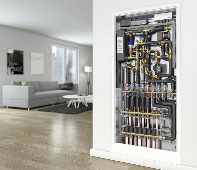 Neu entwickelt wurde die Wohnungsstation FlatConnect für Niedertemperatursysteme mit einer Trinkwarmwasser-Zapfrate von 14 l/min. Bei einer Zapftemperatur von 50 °C ergibt sich daraus eine notwendige System-Vorlauftemperatur von 55 °C, die eine effiziente Betriebsweise einer Wärmepumpe ermöglicht. Das dafür verantwortliche Herzstück ist das hydraulische Regelventil, das eine Heizmittelübertemperatur von lediglich 5 K erlaubt. Hierdurch sind effiziente Niedertemperaturheizsysteme, wie Wärmepumpen, in den unterschiedlichen Varianten integrierbar.