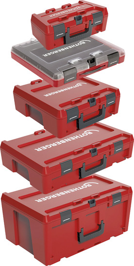 Rothenberger hat drei neue Bestandteile seines Koffersystems vorgestellt: Einen schmalen Werkzeugkoffer mit integrierten Sortierkästen, einen Trolley, auf dem sich diese stapeln lassen und einen rechteckigen Werkzeugeimer. Der Kleinteilekoffer mit transparentem Deckel enthält sechs Boxen. In diesen können Handwerker ihre Verbrauchsmaterialien und Kleinteile aufbewahren. Durch eine Rasterstruktur im Kofferboden werden die Sortierkästen an ihrem Platz gehalten. Eine weitere Neuheit im Koffersystem ist ein Werkzeugeimer, der sich mit den Koffern fest verbinden lässt. Im Lieferumfang ist ein Sortierkasten, der am oberen Rand des Eimers eingehängt werden kann, enthalten. Mit dem zusammenklappbaren Trolley lassen sich mehrere Werkzeugkoffer transportieren. Er ist bis zu 120 kg belastbar. Dank seiner großen Räder ermöglicht er den Transport über Stufen und Treppen. Das Koffersystem besteht somit aus stapelbaren Koffern in fünf Größen, Boxen in zwei Größen, dem Werkzeugeimer und dem Trolley. Die Teile sind aus schlagzähem, witterungsbeständigem ABS-Kunststoff hergestellt. Alle Koffer sind mit einem Klick-System ausgestattet und lassen sich trotz verschiedener Größen miteinander verbinden.