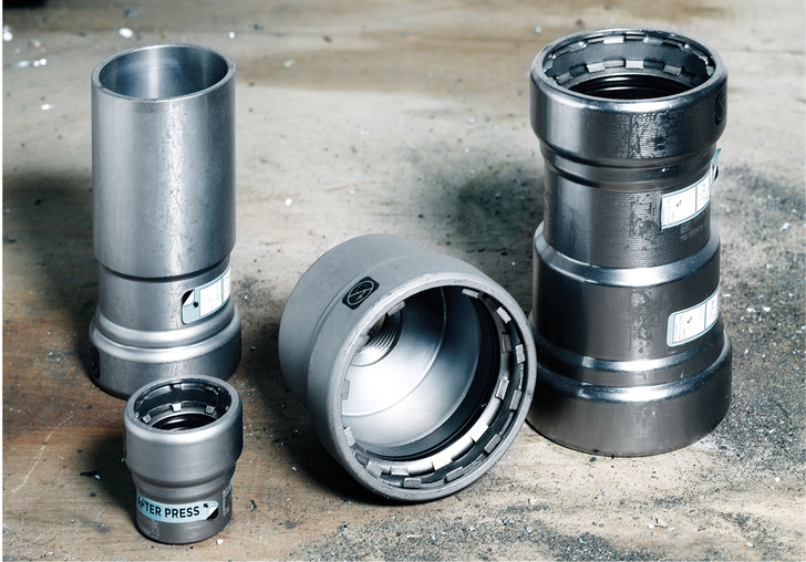 Mit den C-Stahl-Pressfittings der neuen Presssysteme Heavy Steel Press und Heavy Steel Press Gas von Sanha lassen sich dickwandige Stahlrohre alternativ zum Schweißen zeitsparend verpressen. Die Pressfittings sind laut Hersteller u. a. für Heizungs-, Gas- und Kühlwasserleitungen sowie industrielle Anwendungen geeignet.