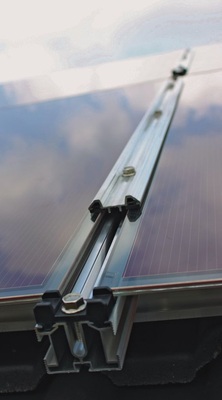 Laminate, speziell Dünnschichtmodule, sind auch bei trübem Wetter effizient und wenig hitzeempfindlich. Allerdings benötigen diese rahmenlosen Module geeignete Montagesysteme wie die neue Variosole DS von Renusol. Das PV-Aufdachsystem basiert auf dem etablierten System Variosole für gerahmte Module. Bei dem neuen System wird jedes einzelne Dünnschichtmodul (Format 110 x 130 cm) mit EPDM-gummierten Klemmleisten befestigt. Die Länge der Klemmleisten orientiert sich an den Maßen der Module. Die notwendige Fixierung wird mittels der Klemmschienen erzeugt. Seitliche Abstandhalter fixieren die Module. Der Unterbau besteht aus dem bewährten Schienensystem Variosole SE, das über spezielle Dachhaken auf die Dachlatten montiert wird.