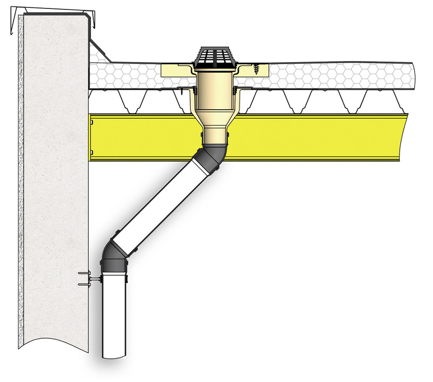 Passend zu den Freispiegelgullys gibt es von Sita ein UV-stabiles PP-Rohrsystem. Die einzelnen Systembauteile sind aufeinander und auf den jeweiligen Freispiegelgully abgestimmt. Sie können direkt an den Dachablauf angeschlossen werden. Ein Steckmuffen-System sorgt für soliden Halt. Der Anbieter gibt eine Druckbeständigkeit von bis zu 1,5 bar an. In der Praxis heißt dies: Problemloser Einbau bis zu einer Hallenhöhe von 15 Metern. Das System ist für die Haupt- und die Notentwässerung im Innen- und Außenbereich einsetzbar. Eingestuft in die Euroklasse E/ Brandschutzklasse B1 gilt es als schwer entflammbar nach DIN 4102.