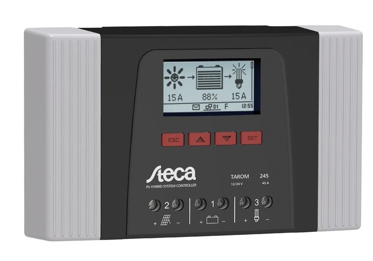 Der Memminger Hersteller Steca Elektronik hat seinen Solarladeregler Tarom 245 erweitert. Er ist für kleine, autarke Photovoltaik-Hybridsysteme und Anwendungen in der Telekommunikation gedacht. Er wurde mit einem grafikfähigen Multifunktionsdisplay (LCD) ausgestattet. Ein kompaktes Designgehäuse erleichtert die Montage. Der neue Laderegler erhielt einige Zusatzfunktionen: Neben der Morgen-, Abend- und Nachtlichteinstellung gibt es nun auch eine Zeitschaltung. Den neuen Steca Tarom 245 gibt es in 12 und 24 Volt sowie 48 Volt mit 45 A Ladestrom. Er verfügt über einen Lastausgang und zwei Relais, die frei konfigurierbar sind. Der Installateur kann beispielsweise Solargeneratoren oder Energiemanagementsysteme anschließen. Weitere Geräte wie ein externer Datenlogger oder ein Temperatursensor lassen sich ebenfalls anbinden. Der Steca PA 15 zur Fernsteuerung und der Datenlogger mit Energiezähler sind in den neuen Tarom bereits integriert. Eine RS-485-Schnittstelle dient dem Anschluss an den PC zur Auswertung des Systems.
