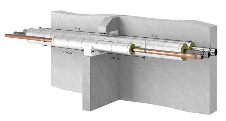Laut Hersteller können mit der 2-in-1-Lösung für Isolierung und Brandschutz die gebräuchlichsten Abschottungen realisiert werden. Die Isolier- und Brandschutzschale ermöglicht eine zum durchdrungenen Bauteil symmetrisch und asymmetrisch angeordnete Dämmung sowie Nullabstände zu nicht brennbaren und brennbaren Rohrleitungen.
