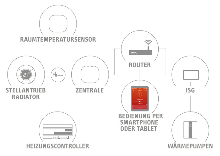 Die Einzelraumregelung besteht aus einer Zentrale, Sensoren zur Erfassung der Raumtemperatur und Funk-Stellantrieben für den Anschluss an Radiatoren sowie einem Controller zur Einbindung der Fußbodenheizung. Die Kommunikation zwischen den Einzelkomponenten erfolgt über Funk (Z-Wave). Die Wunschtemperatur der Räume wird über eine App eingestellt und bei Bedarf mit Zeitprogrammen verknüpft.