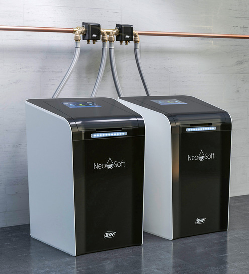 Mit der NeoSoft 8000 Connect von Syr können bis zu 25 Wohneinheiten mit enthärtetem Wasser versorgt werden. Das größte Modell der Enthärtungsanlagenserie besteht aus zwei parallel betriebenen NeoSoft 5000 Connect, die über einen Doppelanschlussflansch verbunden sind. Durch die parallele Durchströmung beider Anlagen werden ein hygienischer Betrieb und eine hohe Durchflussleistung erreicht. Die Anlage wird anschlussfertig geliefert. Ein Touchscreen-Interface führt Schritt für Schritt durch die Einrichtung. Nach der Messung der Rohwasserhärte und der Eingabe der gewünschten Wasserhärte stellt sich die Anlage automatisch ein. Über das Display lassen sich unter anderem Verbrauchsstatistiken, Wartungsintervalle und Betriebsprotokolle abrufen. Eine integrierte Turbine misst kontinuierlich den Wasserverbrauch, sodass der Betriebsmodus automatisch an den aktuellen Stand angepasst wird. Mit einer App ist eine Überwachung und Steuerung der Enthärtungsanlage auch per Smartphone oder Tablet möglich. Relevante Daten werden in Echtzeit protokolliert und lassen sich im Onlinemodus via Push-Benachrichtigung oder per E-Mail übermitteln.