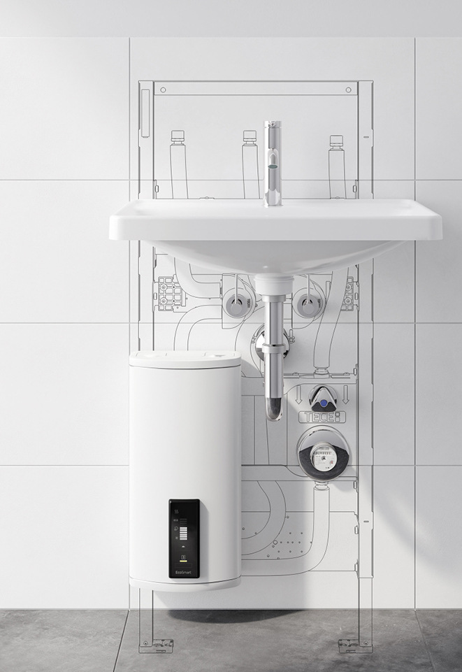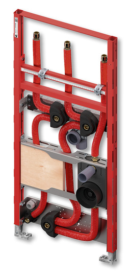 Das Teceprofil-Waschtischmodul für elektronische Durchlauferhitzer vereinfacht die Installation der dezentralen Trinkwassererwärmung. Das Modul ist komplett vorkonfektioniert und für die Aufnahme vieler marktüblicher Durchlauferhitzer vorbereitet: Alle Leitungen und Anschlüsse, die Waschtischaufnahme sowie der Montageblock mit Absperrventil und Wasserzählergehäuse sind fertig im Montagerahmen vormontiert, verrohrt und isoliert. Das 1120 mm hohe Modul wird lediglich mit vier Befestigungspunkten am Baukörper fixiert und mit der Zuleitung und den durchgeschleiften Kalt- und Warmwasserleitungen verbunden. Die Leitungsanschlüsse haben Gewindeübergänge und können so mit allen marktüblichen Rohrsystemen verbunden werden. Für die Befestigung des Durchlauferhitzers ist eine Holzplatte integriert. Damit der Siphon dabei nicht im Weg ist, ist der Waschtisch asymmetrisch etwas nach rechts versetzt.