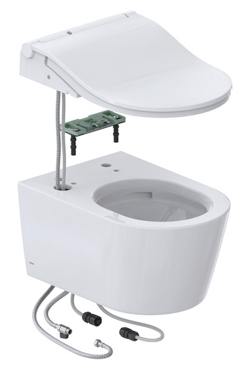 Toto bietet WC-Modelle an, die sich nachträglich zu einem Dusch-WC (Washlet) erweitern lassen. Die Keramiken verfügen bereits über vorbereitete Anschlüsse für Wasser und Strom, die im Standardbetrieb abgedeckt sind. Für die Nachrüstung werden die Abdeckungen entfernt und das Washlet wird montiert. In Kombination mit einem geeigneten Installationsrahmen kann das Upgrade ohne Demontage des WCs erfolgen. Die Lösung ermöglicht eine spätere Ausstattungserweiterung ohne grundlegende Änderungen an der Installation.