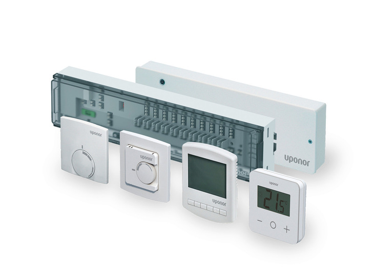 Den Regler 230 V Uponor Base gibt es in zwei verschiedenen Verdrahtungseinheiten beziehungsweise Regelmodulen: Der Uponor Base X-60 nur für Heizen unterstützt bis zu sechs Raumfühler und bis zu zwölf Stellantriebe, der Uponor Base X-80 für Heizen und Kühlen bis zu zehn Raumfühler und bis zu zwölf Stellantriebe. Die in beiden Regelmodulen integrierte Autoabgleich-Funktion sorgt im Betrieb für die permanente Anpassung der Volumenströme an den realen Wärmebedarf im Raum. Das minimiert den Energieverbrauch bei gleichzeitig hohem Komfort, denn die Temperatur bleibt dauerhaft nah am Sollwert und unnötig hohe Raumtemperaturen und damit Wärmeverluste werden vermieden. Die dazugehörigen Base-Raumfühler ergänzt Uponor mit dem T-27 um einen digitalen Raumfühler. Auch 230-V-Raumfühler von anderen Herstellern können mit den Base-Regelungen kombiniert werden. Weil nur ein dreiadriges Kabel als Anschluss benötigt wird, können mit dem neuen System auch bestehende Flächenheizungsregelungen umgerüstet werden. So kann mit den Reglern Uponor Base X-60 und X-80 der energiesparende Autoabgleich auch in der Modernisierung und bei spezifischen Designwünschen des Kunden eingesetzt werden.